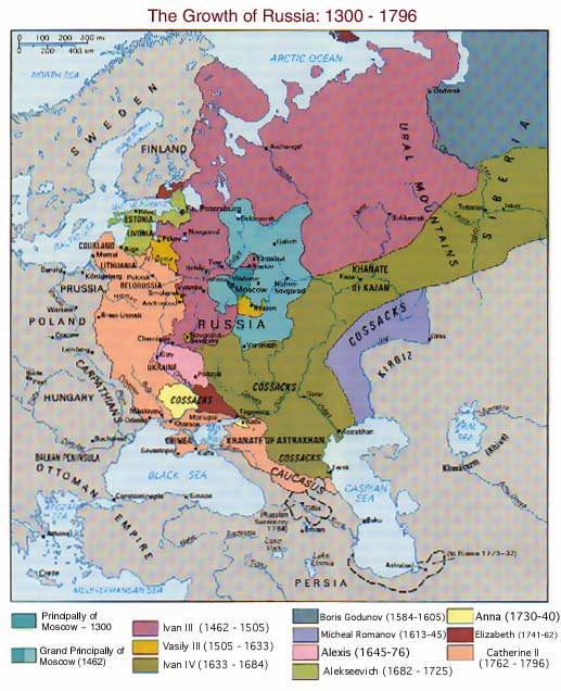 The largest country in the world, Russia originated from the principality of Muscovy in the 14th century, and expanded tremendously throughout the following centuries; by the early 20th century encompassing Finland, Eastern Poland (including Warsaw), and the Eastern portions of present-day Hungary, Romania, and Czechoslovakia. The capital of Russia is Moscow (1547 - 1712; 1918 - present), but had been located in Petrograd from 1712 to 1917.