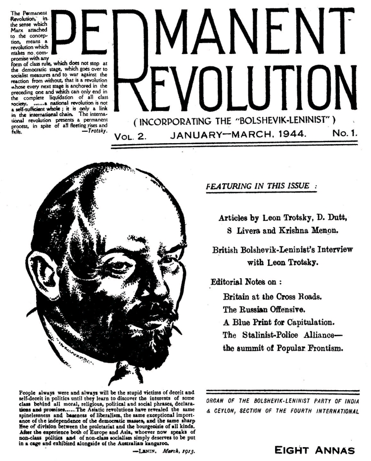 Reproduction of the front page of Permanent Revolution, theoretical organ of the Bolshevik-Leninist Party of India, which appears under British illegality. The editors of Permanent Revolution state: “As we enter the second year of our existence we can look back with legitimate pride at the progress made in 1943. In spite of the many difficulties the Permanent Revolution has established itself as the leading Marxist theoretical journal in India and Ceylon. It occupies the foremost place in the underground press of India.”