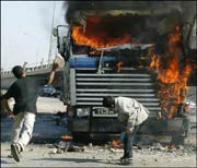 Iraqis throws bricks at a burning truck that was attacked by insurgents on the road leading to Baghdad's airport. A convoy of US army oil tankers came under rocket-propelled grenade attack in Baghdad's western suburb of Abu Ghraib. AFP/Karim Sahib