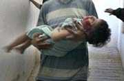 Nura, 3, an Iraqi child wounded during fighting between US forces and Sunni insurgents is rushed into a public clinic by her father, no name given, in Fallujah, Iraq, Thursday April 8, 2004. (AP Photo/Muhammed Muheisen)