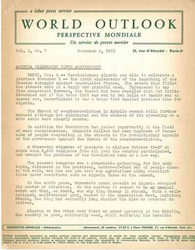 World Outlook was published by Pierre Frank, Joseph and Reba Hansen in Paris, France. It was published in 1963 under the auspices of newly created United Secretariat of the Fourth International. Published out Paris it was eventually moved to New York City and published by the US Socialist Workers Party as a fraternal courtesy to the USFI. With the change of location it started, under Joseph Hansen’s editorship, reflecting the politics of the SWP and away from the strictly European USFI influence. In 1968 it was renamed Intercontinental Press. World Outlook started publishing twice-monthly initially then within a few months started publishing weekly. The reporting in the magazine focused on the goings on and activities of the world Trotskyist movement in the 1960s as well as analysis of the major events of the period, from the Cuban Missile Crisis through counter-revolutionary coup in Indonesia in 1965 to the rise of the May events in France in 1968.