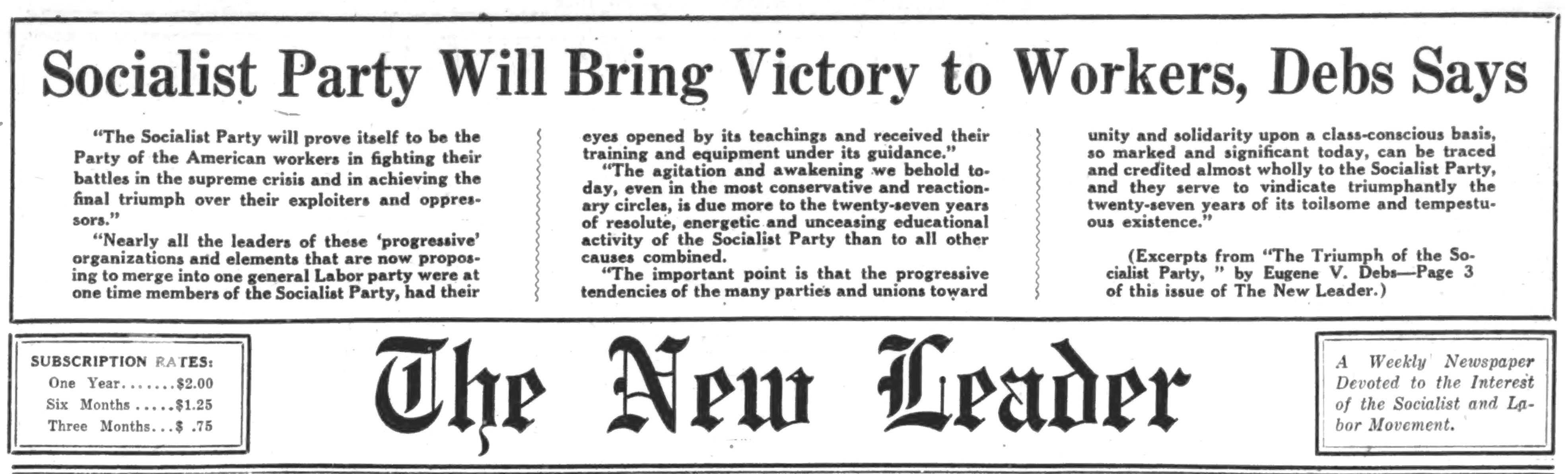 The New Leader began as a weekly newspaper published by the Socialist Party in New York City in 1924. Among the SP luminaries who wrote for it were Eugene V. Debs, Morris Hillquit, Norman Thomas, Oscar Ameringer, James Oneal, and John M. Work. It remained a flagship paper of the SP through the 1920s.
