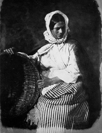 Le fotografie di Daguerre erano lastre d'argento iodurate impresse nella camera oscura, che dovevano esser rigirate più volte per poter, con la giusta illuminazione, distinguer un'immagine d'un grigio delicato. Erano pezzi unici; nel 1839 in media una lastra costava 25 franchi oro. Non di rado erano custodite in astucci come gioielli. Ma certi pittori le usavano come ausili tecnici. Come Utrillo, 70 anni dopo, avrebbe realizzato le sue affascinanti vedute di case della banlieue parigina tramite cartoline illustrate (anziché dal vero), il noto ritrattista inglese David Octavius Hill basò il suo affresco del primo sinodo generale della Chiesa scozzese (1843) su un'ampia serie di ritratti fotografici (fatti però di persona). E sono tali lastre senza pretese, semplici sussidi destinati a un uso interno, a consegnare alla storia il nome di Hill (negletto come pittore). Più che tali serie di ritratti, introducono alla nuova tecnica alcuni studi di Hill: immagini di persone anonime, non veri ritratti. Figure simili esistevano già da tempo nei dipinti. Se restavano possessi di famiglia, talvolta ci si interrogava sul modello raffigurato. Ma dopo due o tre generazioni tale interesse sparisce: i quadri durano solo come testimonianza dell'arte di chi le ha dipinte. Invece nel caso della fotografia scopriamo un che di nuovo: nella pescivendola di New Haven, che guarda a terra con un pudore così spontaneo e seducente, resta un che non esauribile nella testimonianza dell'arte del fotografo Hill, un che non si riesce a tacere, che esige forte il nome di colei che lì ha vissuto, che in tal immagine è ancora reale e che mai vorrà lasciarsi tutta dissolvere dall'«arte».