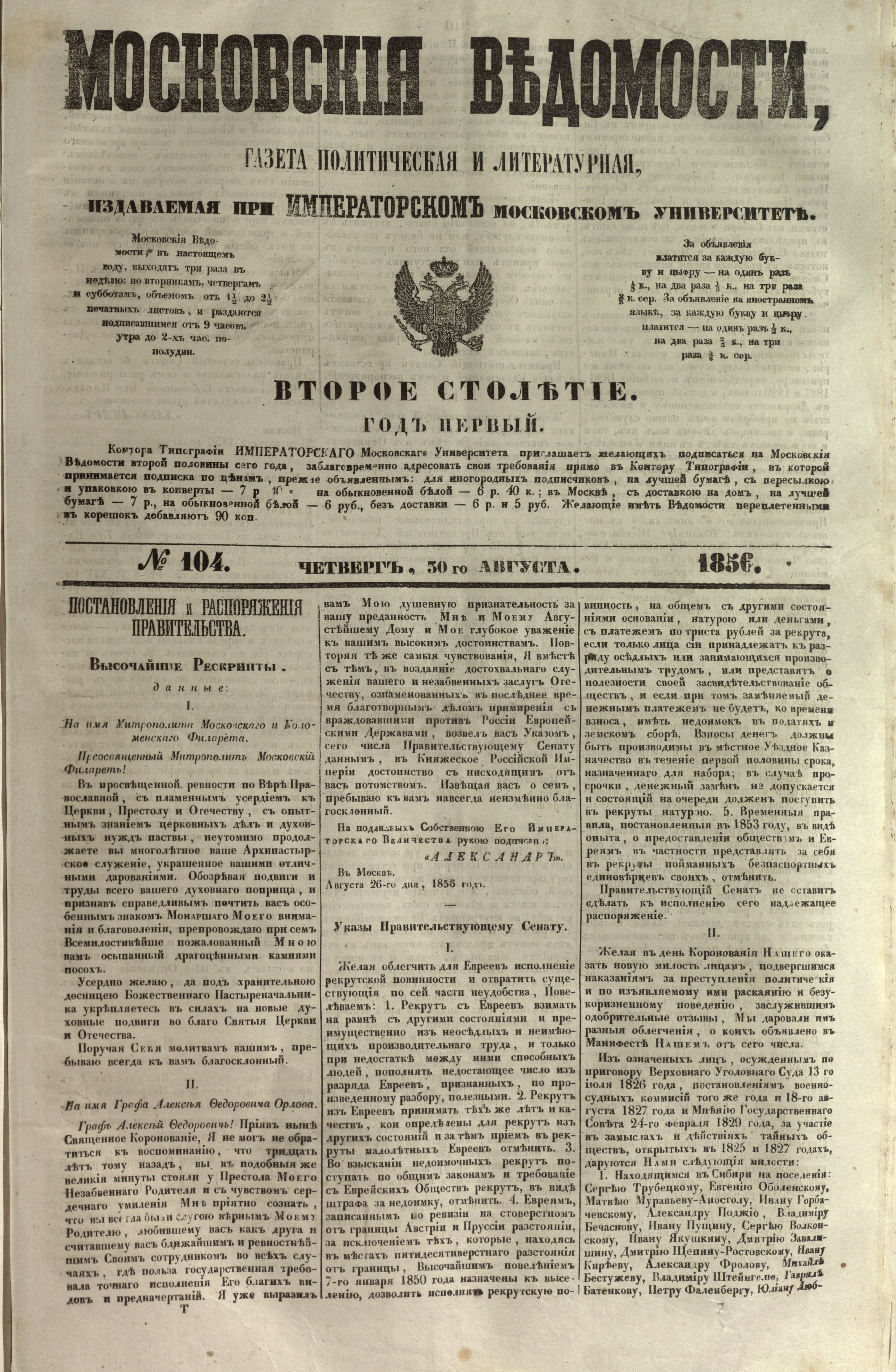 Imagem: folha de rosto do jornal nº. 104, de 30 de agosto de 1856. Clique na imagem para ampliar