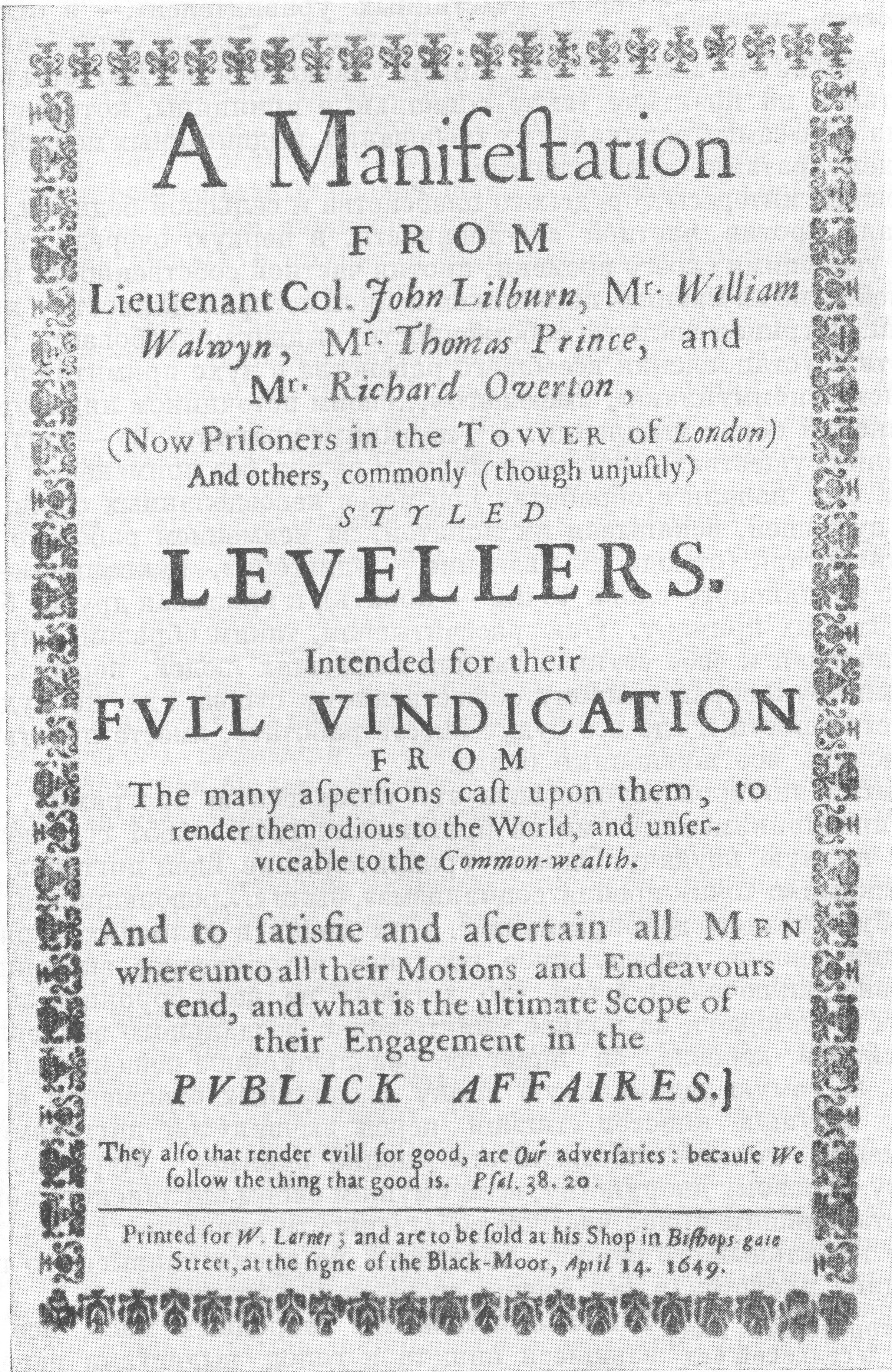 (1647-1650): Partido inglês (1647-1650) que reivindica uma igualdade de natureza civil e política, mas não a igualdade económica, nem põe em causa a propriedade privada. Em matéria religiosa são partidários da tolerância. O seu mais notável representante foi John Liburne (1618-1657). Defendiam a representação popular e a devolução da terra senhorial às comunas.