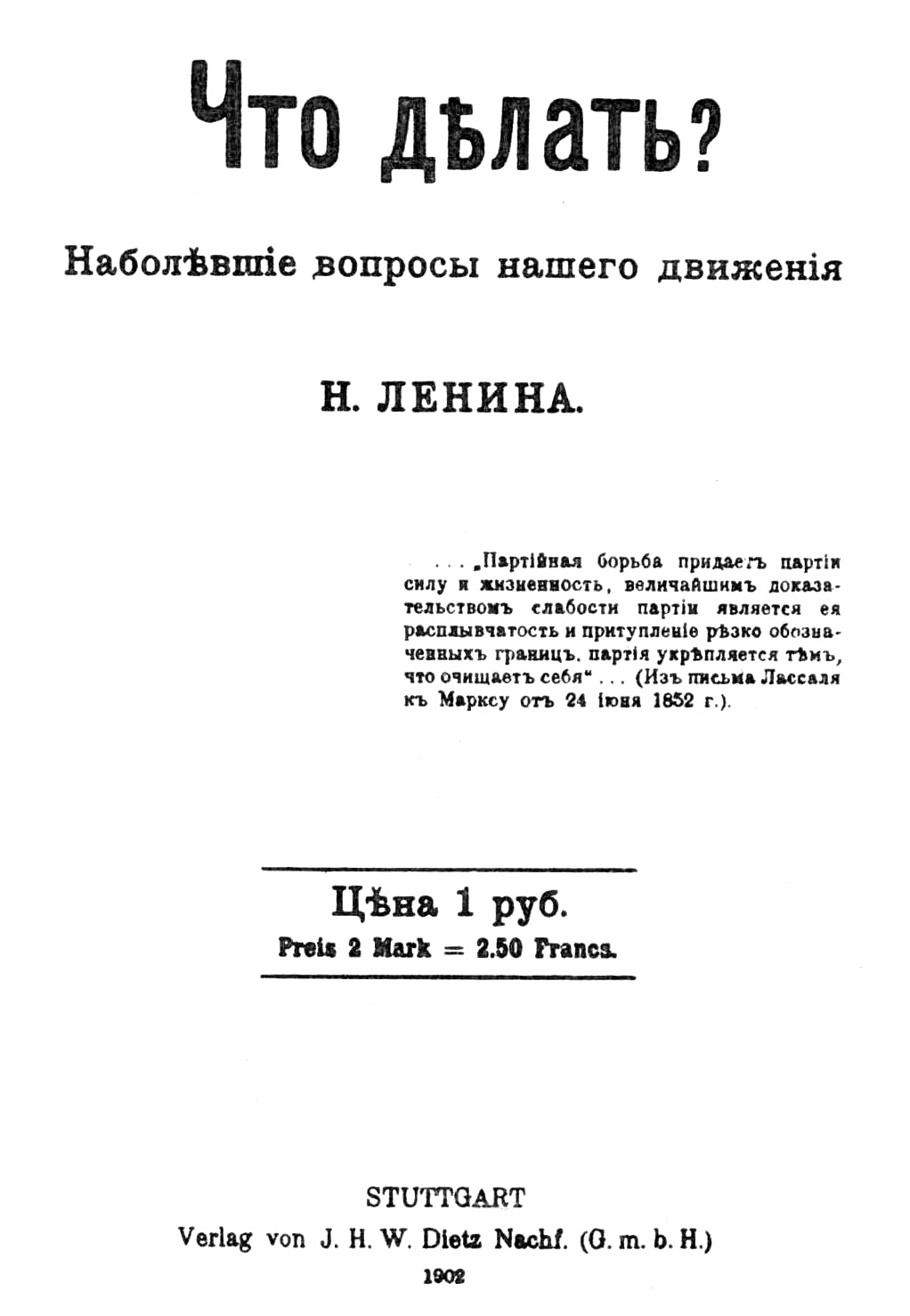 (1) O livro Que Fazer? Problemas Candentes do Nosso Movimento foi planeado por V. I. Lénine já na Primavera de 1901. Mas só no Outono de 1901 Lénine começou a trabalhar com empenho neste livro. Em Dezembro, no n° 12 do Iskra, foi publicado o artigo de Lénine Conversa com os Defensores do Economismo , a que ulteriormente deu o nome de esboço para Que Fazer? . Em Janeiro de 1902 Lénine terminou o livro e em Fevereiro escreveu o prefácio para o mesmo. No princípio de Março Que Fazer? foi publicado em Stuttgart na Editorial Dietz.
