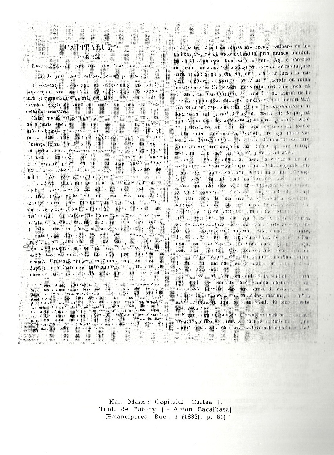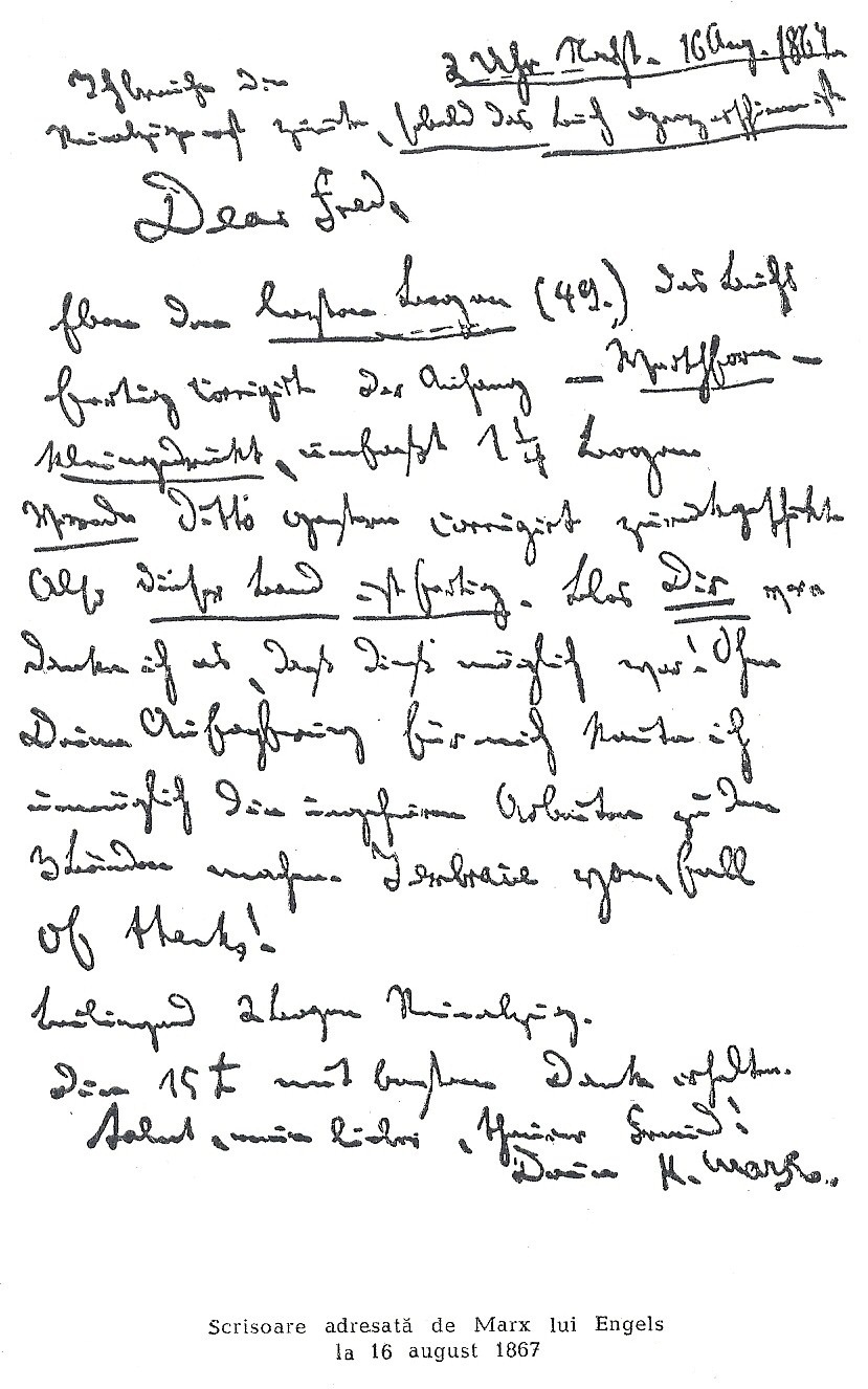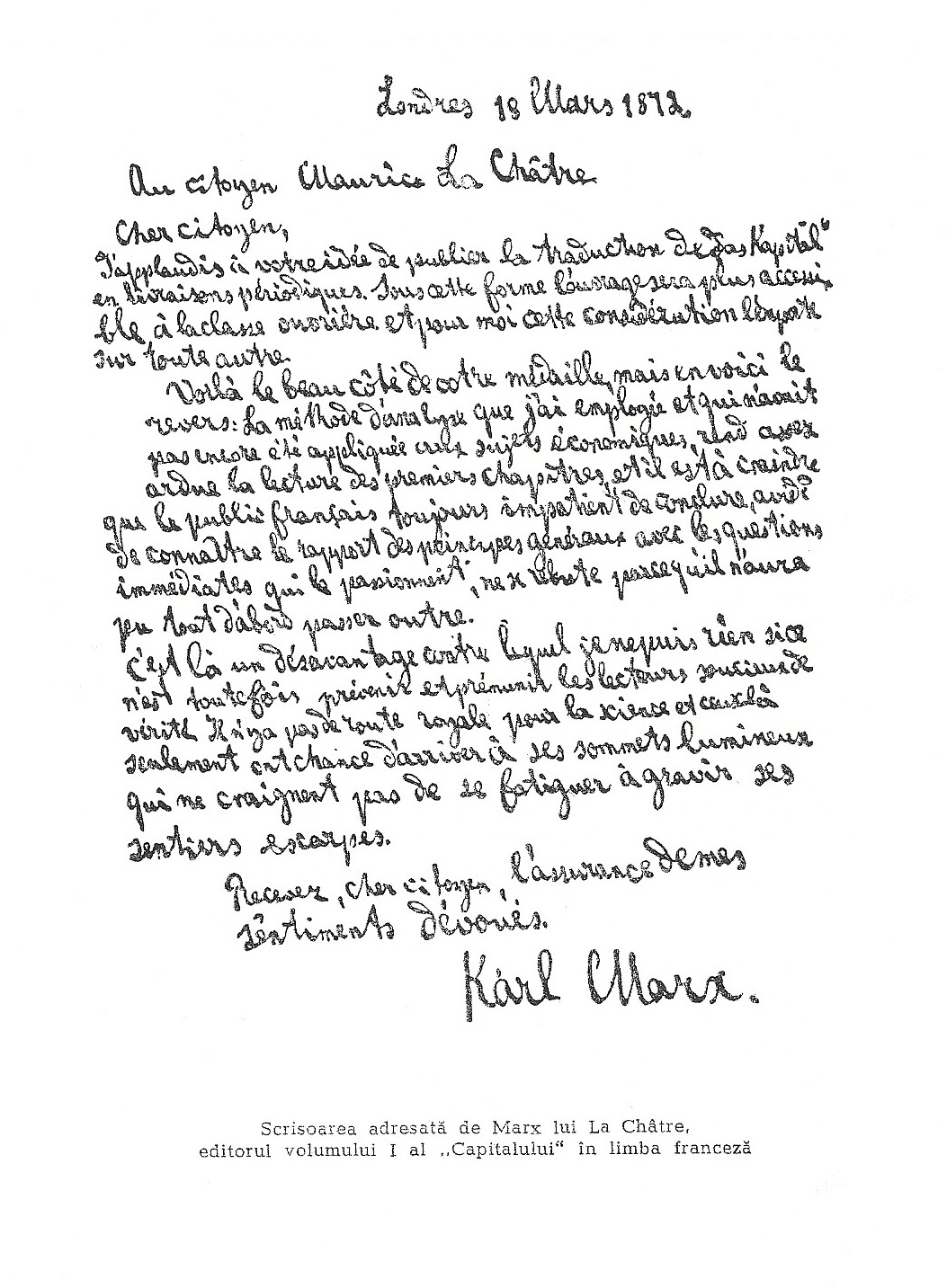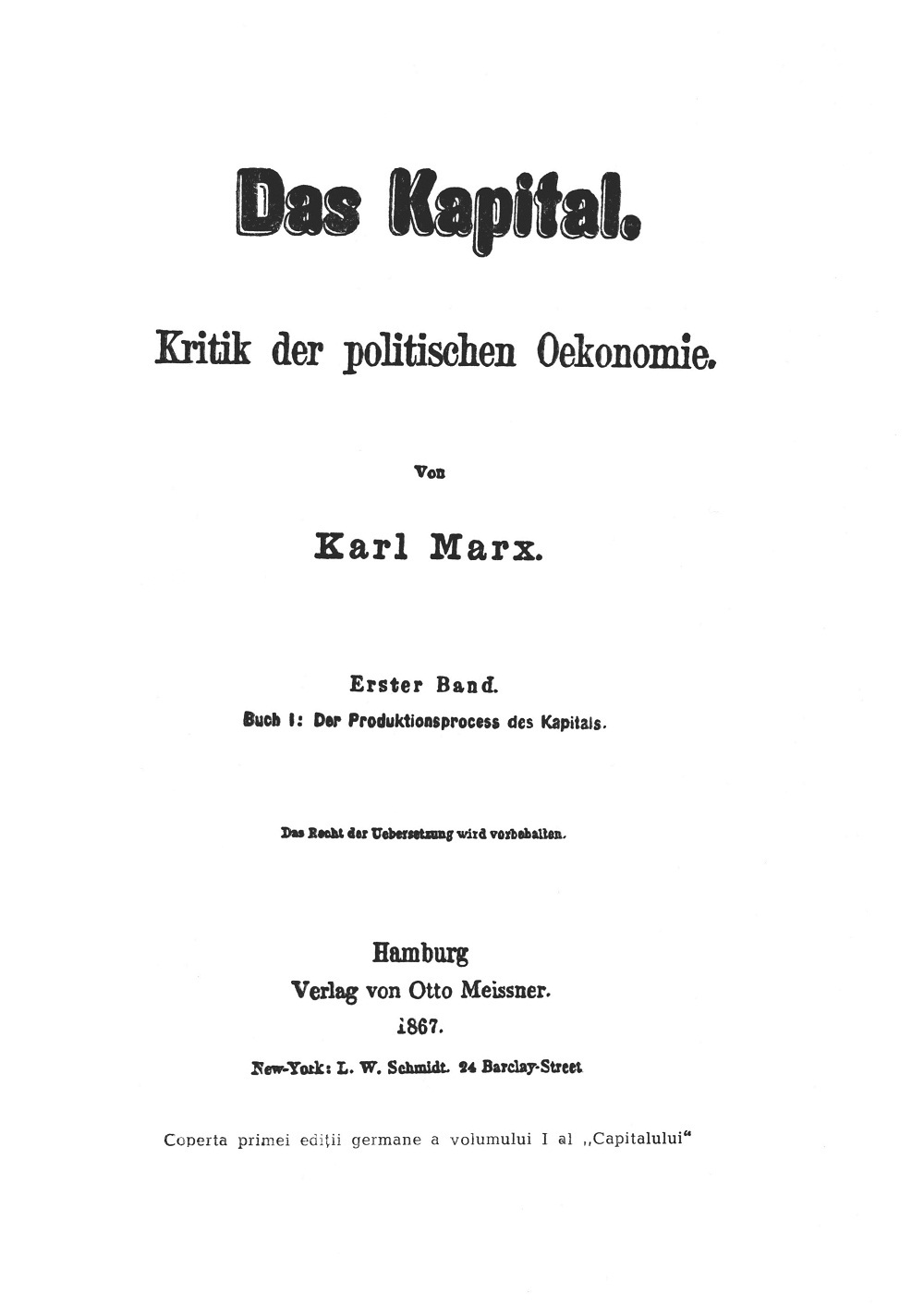 ![]() „Capitalul“ este opera genială a lui Karl Marx. La făurirea operei sale fundamentale Marx a lucrat patru decenii, de la începutul deceniului al 5-lea şi pînă la sfîrşitul vieţii. „Ajungînd la concluzia că orînduirea economică este baza pe care se înalţă suprastructura politică, Marx a acordat o deosebită atenţie studierii acestei orînduiri economice“ (V. I. Lenin. Opere complete, vol. 23, Bucureşti, Editura politică, 1964, ed. a doua, p. 45). Marx a început să studieze sistematic economia politică la sfîrşitul anului 1843, la Paris. Studiind literatura economică, el şi-a propus să scrie o lucrare vastă care să cuprindă critica orînduirii sociale existente şi a economiei politice burgheze. Primele sale cercetări în acest domeniu s-au oglindit în lucrări ca: „Manuscrise economice-filozofice din 1844“, „Ideologia germană“, „Mizeria filozofiei“, „Muncă salariată şi capital“, „Manifestul Partidului Comunist“ şi altele. Încă în aceste lucrări sînt dezvăluite bazele exploatării capitaliste, contradicţia de neîmpăcat dintre interesele capitaliştilor şi cele ale muncitorilor salariaţi, caracterul antagonist şi efemer al tuturor relaţiilor economice ale capitalismului. După o întrerupere impusă de evenimentele furtunoase ale revoluţiei din 1848—1849, Marx şi-a putut continua cercetările sale economice abia la Londra, unde a fost nevoit să emigreze în august 1849. Aici el a studiat profund şi multilateral istoria economiei şi economia din acea vreme din diferite ţări, îndeosebi din Anglia, care era în acea vreme ţara clasică a capitalismului. În această perioadă pe el l-a interesat istoria proprietăţii funciare şi teoria rentei funciare, istoria şi teoria circulaţiei banilor şi a preţurilor, crizele economice, istoria tehnicii şi tehnologiei, problemele de agronomie şi de agrochimie. Marx a lucrat în condiţii neînchipuit de grele. El a trebuit să lupte în permanenţă împotriva lipsurilor materiale şi adesea să-şi întrerupă studiul pentru a cîştiga cele necesare traiului. Efortul îndelungat în condiţiile lipsurilor materiale nu a rămas fără urmări — Marx s-a îmbolnăvit grav. Totuşi, pînă în 1857 el a reuşit, datorită unei uriaşe munci de pregătire, să treacă la etapa finală — la sistematizarea şi generalizarea materialului adunat. Din august 1857 pînă în iunie 1858 Marx a pregătit un manuscris de circa 50 coli de tipar care a constituit un fel de ciornă a viitorului „Capital“. Acest manuscris a fost publicat pentru prima oară abia în 1939—1941 de Institutul de marxism-leninism de pe lîngă C.C. al P.C. al U.R.S.S. în original, sub titlul „Grundrisse der Kritik der politischen Oekonomie“. În noiembrie 1857 Marx a elaborat, în afară de aceasta, planul operei sale, pe care ulterior l-a detaliat, făcînd totodată precizări esenţiale. Această lucrare ştiinţifică consacrată criticii categoriilor economice se împarte în şase cărţi: 1) Despre capital (cu cîteva capitole introductive); 2) Despre proprietatea funciară; 3) Despre munca salariată; 4) Despre stat; 5) Despre comerţul internaţional; 6) Despre piaţa mondială. În prima carte („Despre capital“) Marx a prevăzut patru secţiuni: a) Capitalul în general, b) Concurenţa dintre capitaluri, c) Creditul, d) Capitalul pe acţiuni. Secţiunea a) „Capitalul în general“ are trei capitole: 1) Procesul de producţie a capitalului; 2) Procesul de circulaţie a capitalului şi 3) Unitatea dintre amîndouă sau capital şi profit, dobîndă. Este important de relevat faptul că această din urmă împărţire specială a constituit ulterior baza împărţirii întregii lucrări în trei volume. Istoria economiei politice şi a socialismului urmau să alcătuiască obiectul altei lucrări. Totodată, Marx a hotărît ca lucrarea sa să apară în fascicule separate, iar prima fasciculă, care „ar trebui să reprezinte într-o oarecare măsură întreaga lucrare“ să cuprindă numai prima secţiune din prima carte — secţiune alcătuită din trei capitole: 1) Marfa, 2) Banii sau circulaţia simplă şi 3) Capitalul. Dar, din considerente politice, capitolul al treilea nu a fost inclus în varianta definitivă a primei fascicule — în lucrarea „Contribuţii la critica economiei politice“. Marx a arătat că tocmai în acest capitol „începe adevărata bătălie“ şi că, după părerea lui, era inoportun, în condiţiile cenzurii oficiale, ale şicanelor poliţieneşti şi ale mizeriilor de tot felul făcute autorilor care nu erau pe placul claselor stăpînitoare, să publice la început acest capitol, adică înainte ca noua lucrare să fi cîştigat o largă popularitate. Pentru „prima fasciculă“, Marx a scris special capitolul despre marfă şi a refăcut capitolul despre bani elaborat în 1857—1858. Lucrarea „Contribuţii la critica economiei politice“ a apărut în 1859. Se intenţiona să se publice în scurt timp şi „fascicula a doua“, adică capitolul menţionat mai sus despre capital, care constituia conţinutul principal al manuscriselor din 1857—1858. Marx reia studiul sistematic al economiei politice la British Museum. Curînd însă el este nevoit să întrerupă această muncă pentru un an şi jumătate, trebuind să demaşte în presă pe agentul bonapartist K. Vogt, care pornise împotriva sa o serie de atacuri calomnioase, şi să rezolve o serie de alte treburi curente. Abia în august 1861 el începe să lucreze din nou la acest vast manuscris, pe care îl termină la jumătatea anului 1863. Manuscrisul, cu un volum de circa 200 de coli de tipar, reprezentînd 23 de caiete, purta acelaşi titlu ca şi lucrarea din 1859, „Contribuţii la critica economiei politice“. Cea mai mare parte din manuscris (caietele VI—XV şi XVIII) tratează despre istoria doctrinelor economice. Această parte a fost pre