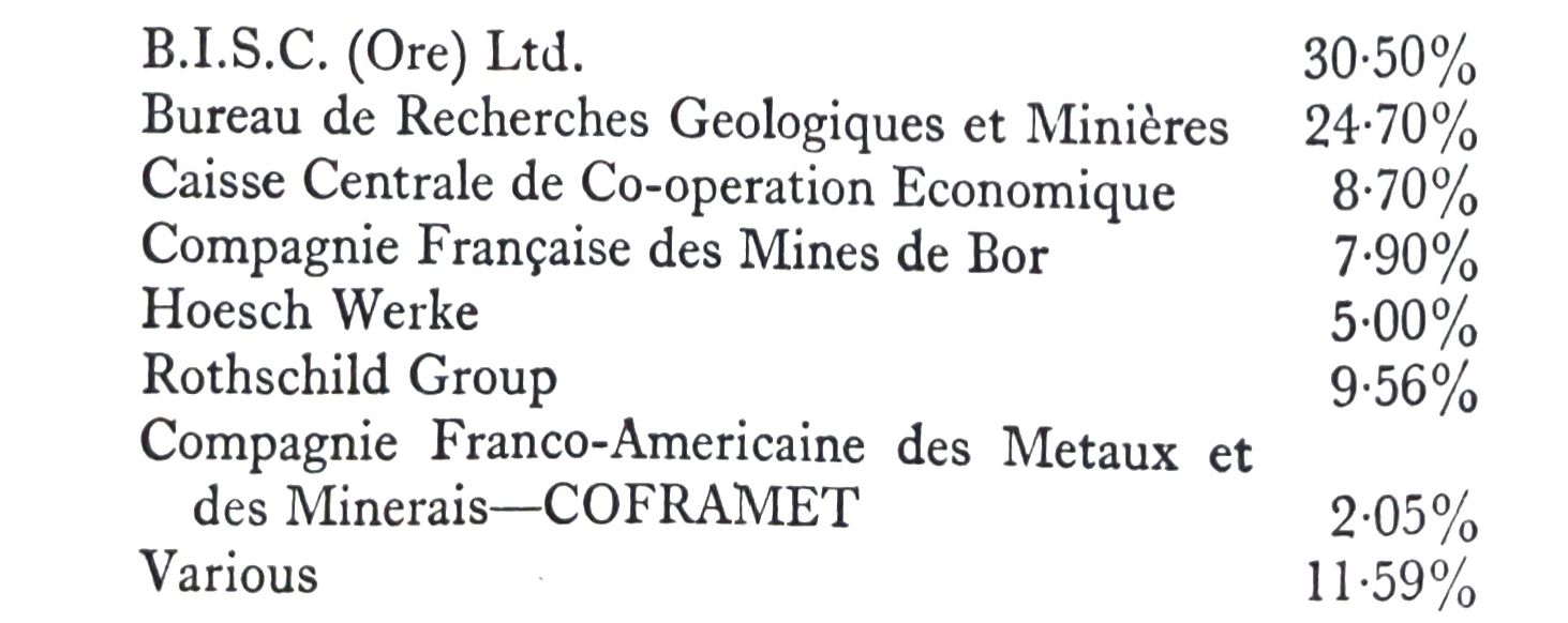 B.I.S.C. (Ore) Ltd. is also included in a consortium, Société Anonyme des Mines de Fer de Mauritanie – MIFERMA – exploiting iron ore at Fort Gouraud, Mauritania. It is estimated that there is a minimum of 100 million tons of high-grade ore of 64-65 per cent iron contained in this property on the western edge of the Sahara Desert, and it is being prepared to produce an annual output of six million tons. The British group as well as German and Italian groups have substantial holdings, but the major interest is held by a French group headed by the Bureau Minière de France d'Outre Mer. The following are the participants in this venture:
