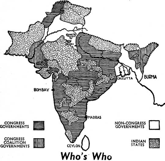 In the 1937 elections the Congress secured two out of every three votes cast. Congress Governments were formed in 9 out of 11 Provinces. The map at the beginning of this pamphlet shows clearly the very widespread influence of Congress in the provinces of British India. At the outbreak of war only two provinces of British India had non-Congress Governments. A National Government would obviously be mainly based on the National Congress, and support its policy. This would be in the interests of all sections.