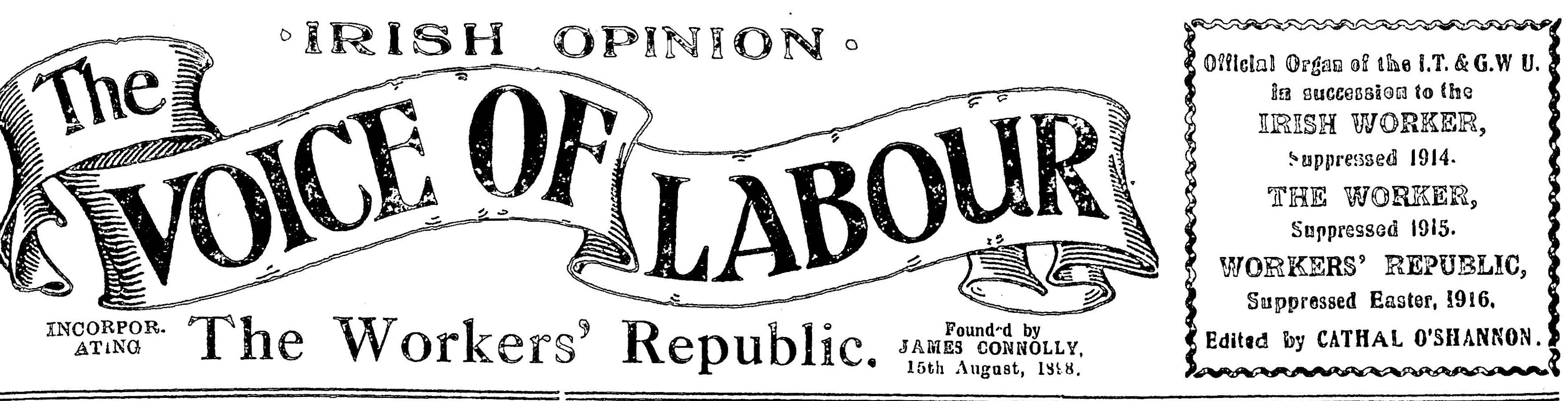 The Voice of Labour weekly was the successor to Irish Opinion, a paper started in 1917 by followers of James Connolly seeking to revive the Irish revolutionary movement after Easter Week. In April 1918 The Voice of Labour replaced Irish Opinion and, with the revival of the Irish Transport and General Workers Union (ITGWU), soon became the official organ of the Union. ITGWU Acting General Secretary’s James Connolly role in Easter Week helped cement the Irish labour movement’s links with Ireland’s struggle for freedom from British rule and The Voice of Labour reflected this unity. The paper declared itself to be the successor to both Jim Larkin’s Irish Worker newspaper of the pre-war ITGWU, suppressed by the British government in 1914, and James Connolly’s newspaper, The Workers’ Republic, suppressed in 1916.