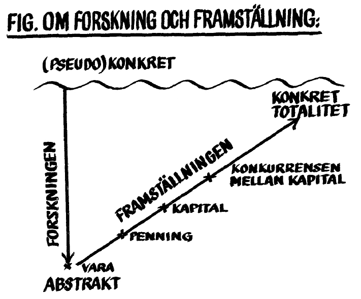 "... metoden att stiga från det abstrakta till det konkreta /är/ bara tänkandets sätt att tillägna sig det konkreta, att reproducera det som något andligt konkret." (Grundrisse, s. 22/Grunddragen, s. 31.)
