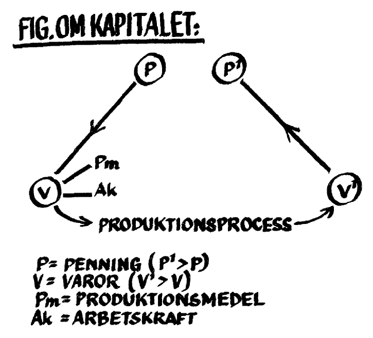 Kapitalet (rättare: "kapital i allmänhet" = kapitalets mest abstrakta grundbestämningar) - kapitalets formel: P - V - P1; processerande bytesvärde. (a) Kapitalets omedelbara produktionsprocess. (K, 127/161 - första bandet ut). (b) Kapitalets omedelbara cirkulationsprocess. (Kapitalet, II).