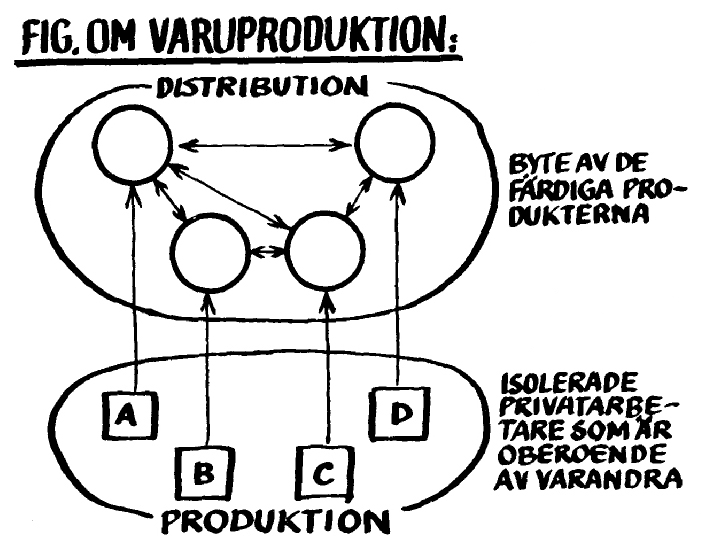 Under varuproduktionen är situationen en helt annan. Det privata ägandet av produktionsmedel och produkter innebär, att arbetet omedelbart är privat, att den enskilde omedelbart arbetar för sig själv. I produktionsprocessen är de olika privatarbetarna oavhängiga av varandra och konsekvensen av denna atomisering av samhällsmedlemmarna är att den totala produktionsprocessen blir anarkistisk och planlös.