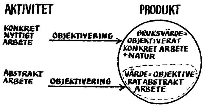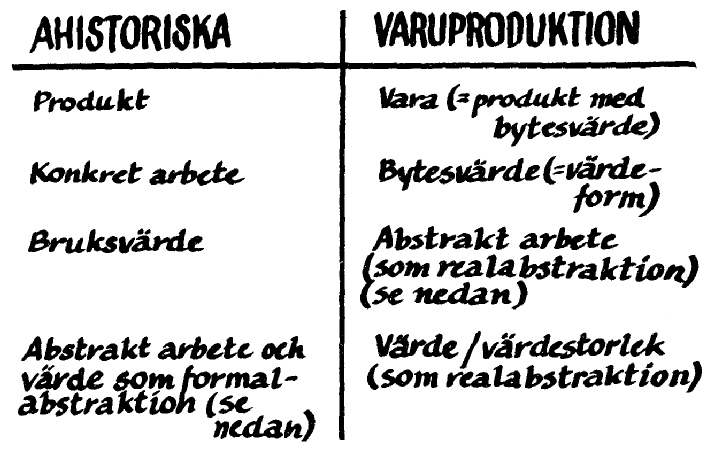 [4] Angående terminologin: Varan är (till sitt väsen) värde, men den framträder som bytesvärde (jfr. t.ex. K. 53f/75); bytesvärdet uttrycker, framställer eller formger värde.