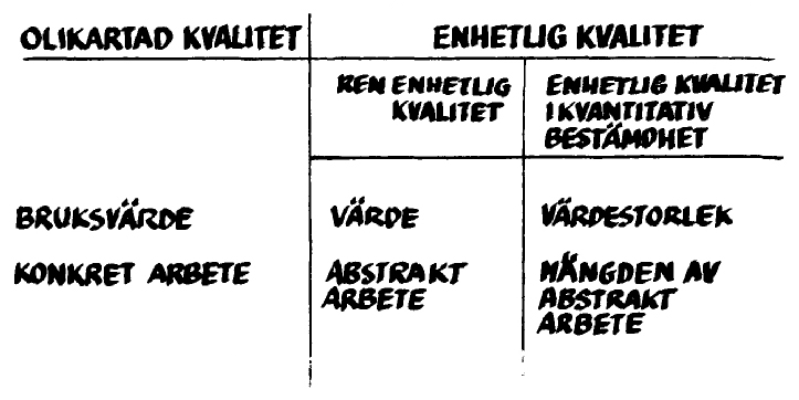 Vilken? Svaret på denna fråga (K, 33f/51f) försvåras av att produkterna i sin omedelbarhet är bruksvärden och därmed har olika egenskaper, olika kvalitet. För att bestämma den gemensamma, enhetliga kvaliteten är det därför nödvändigt att bortse från det specifika bruksvärdet. Resultatet av denna abstraktionsprocess blir att den återstående, gemensamma kvaliteten är att alla varor är produkter av abstrakt arbete, alltså besitter värde.