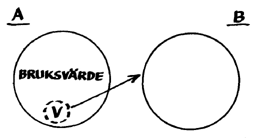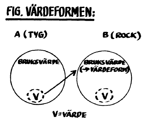 [9] Det måste understrykas: B innehåller eller förkroppsligar (verkörpern) sitt eget värde, men den framställer eller ger form åt A's värde. Vidare: I hela Marx' argumentation är det endast A's värde, som antar form och endast B's bruksvärde, som ger värdet form, är värdeform; detta korresponderar med att Marx' ståndpunkt är A eller rättare: A's värde.