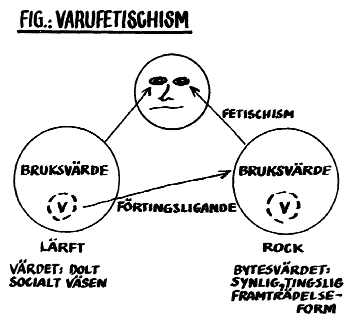 [16] Det kan diskuteras, om Marx' fetischismbegrepp är identiskt med det ovan nämnda, eller om han i detta inkluderar det fenomen, som jag har kallat förtingsligande (jfr. K, 6 63f/86f). Det avgörande är emellertid att Marx skiljer mellan de tingsliga framträdelseformerna och människans uppfattning om dessa - mellan den reella förvrängningen och den förvrängning, som utgår från medvetandet.