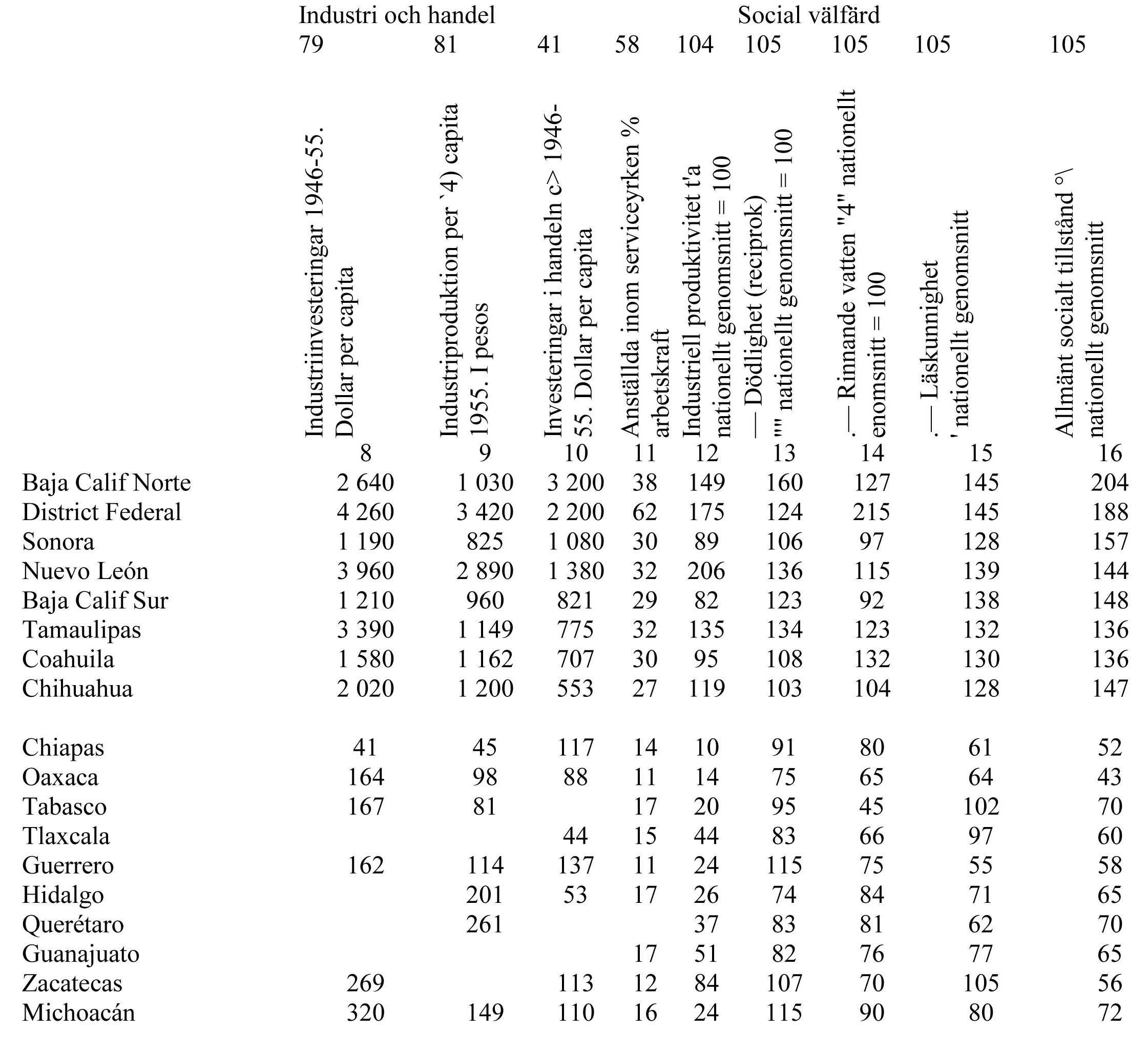 Källa: Paul L. Yates, El Desarollo Regional de México. Siffrorna högst upp hänvisar till Yates för varje kolumn.
