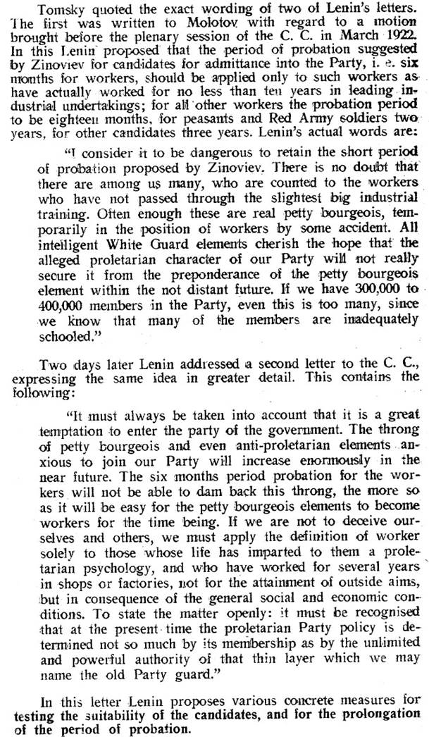Följande är ett klipp från Inprecor Vol.6 No.7, som återger den diskussion om CK:s politiska och organisatoriska rapporter som fördes vid kommunistpartiets 4:e partikongress (i december 1926), Klippet är ur ett inlägg av Tomskij (från s. 92) som citerar två brev av Lenin (från 24 resp 26 mars 1922). Breven finns i svensk översättning: Om betingelserna för upptagandet av nya medlemmar i partiet (Shachtman citerar det andra av breven).